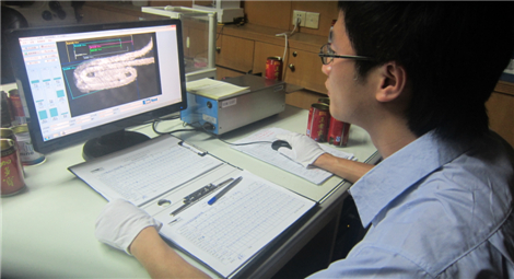 • QC is is testing the welding quality with the top ball experimental instrument.